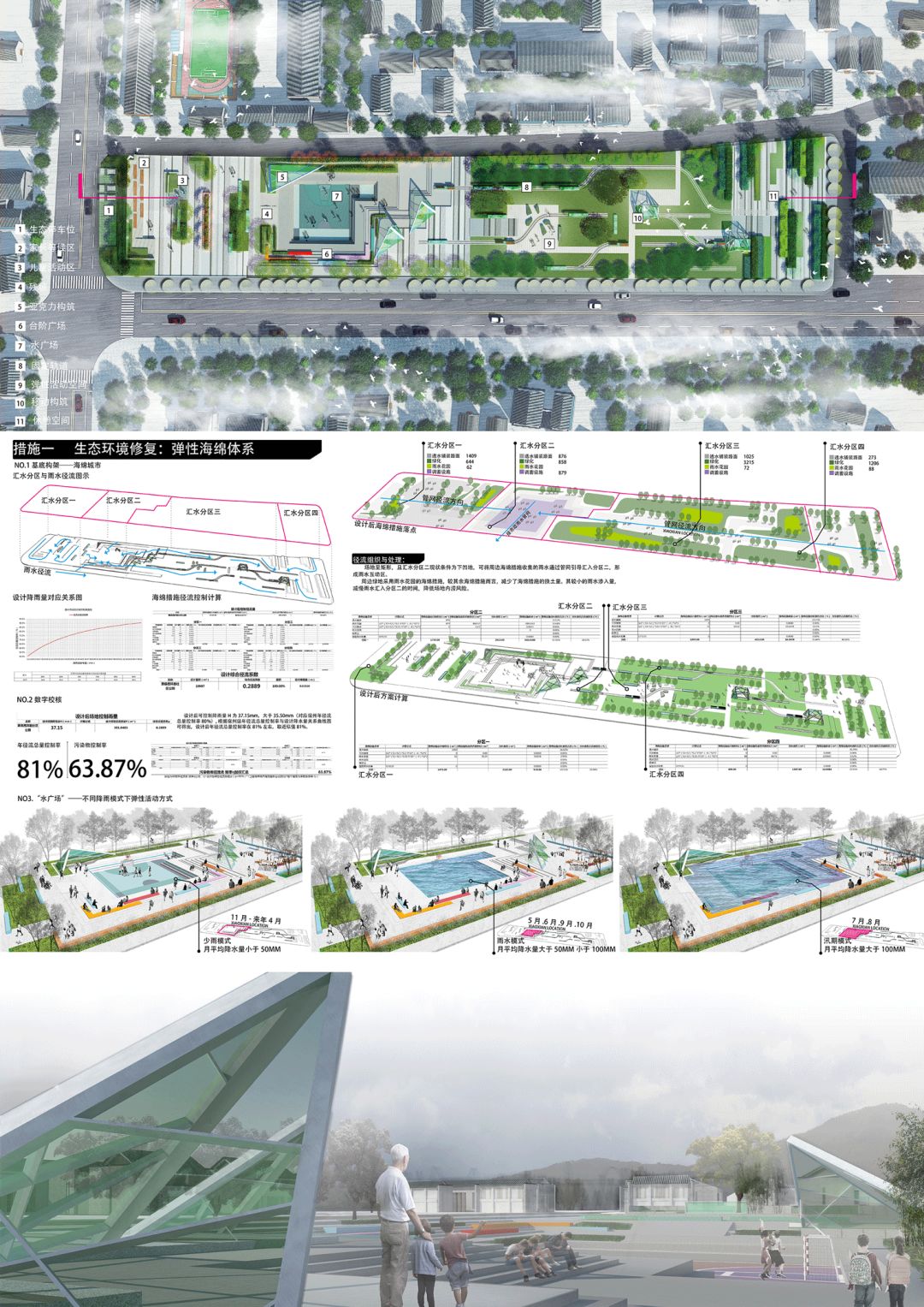 提供一套彈性海綿體系。在場(chǎng)地敏感區(qū)建立“水廣場(chǎng)”空間,用以減輕內(nèi)澇風(fēng)險(xiǎn),修復(fù)場(chǎng)地生態(tài)。