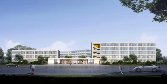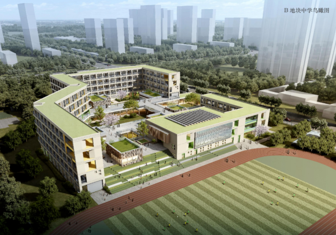 B 地塊:36 班初中總用地面積 43711.11 ㎡,總建筑面積 42520.14 ㎡,其中地上建筑面積27183.52 ㎡,地下建筑面積 15336.62 ㎡。地上最高 5 層,建筑高度 23.4 米,地下一層。地上主要功能為教學(xué)樓、食堂、報(bào)告廳、行政辦公、風(fēng)雨操場(chǎng)等。地下主要功能為停車和設(shè)備用房等。